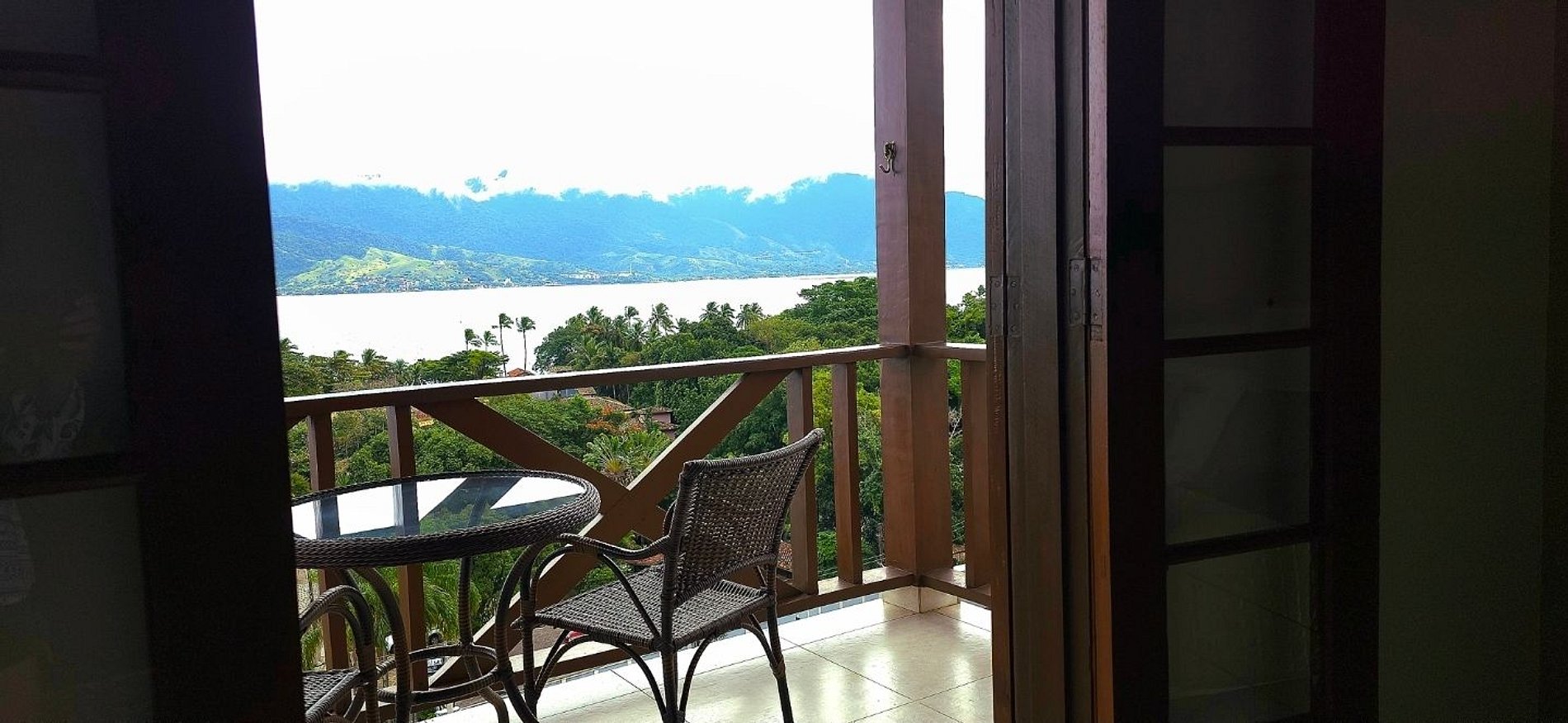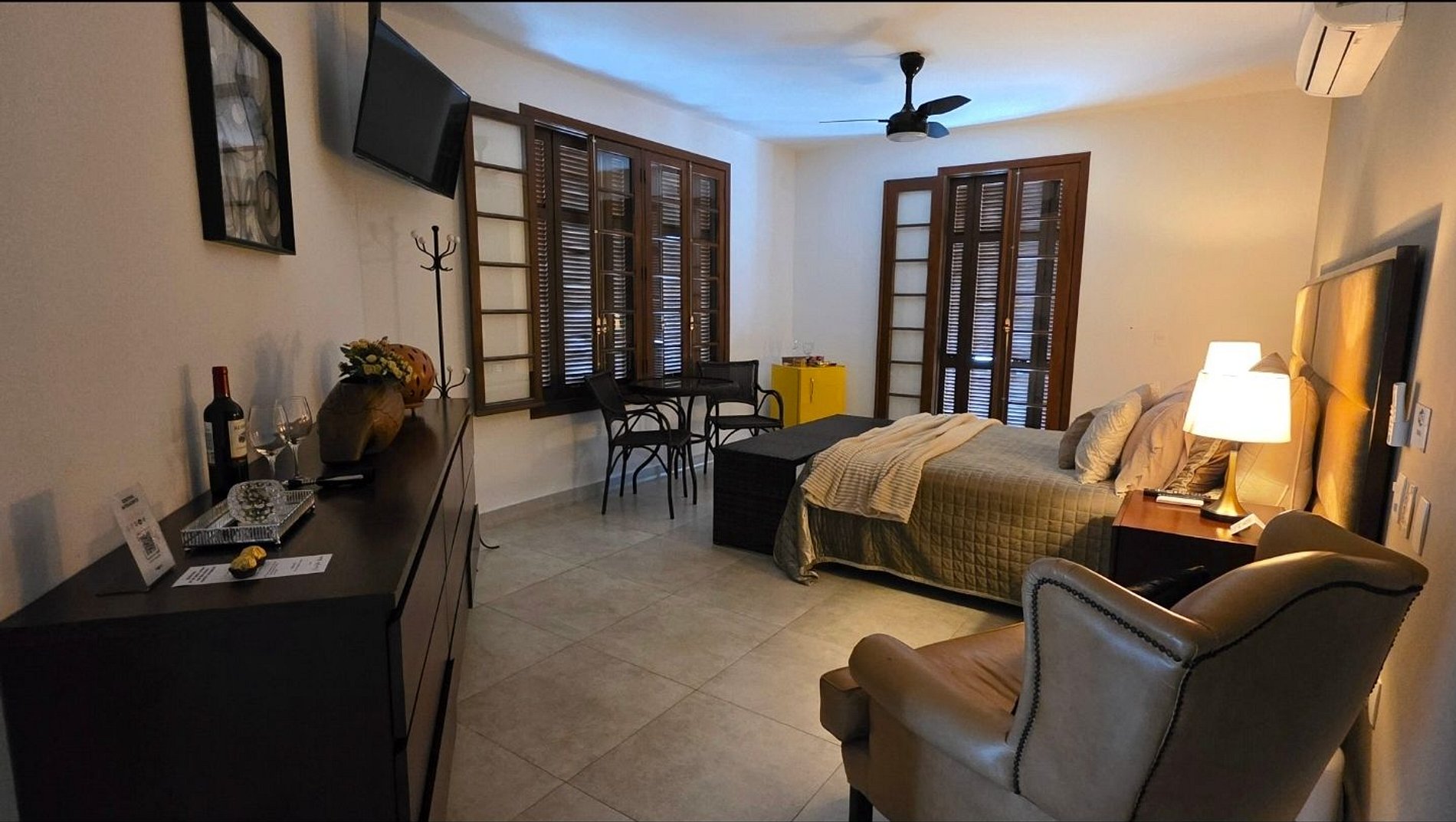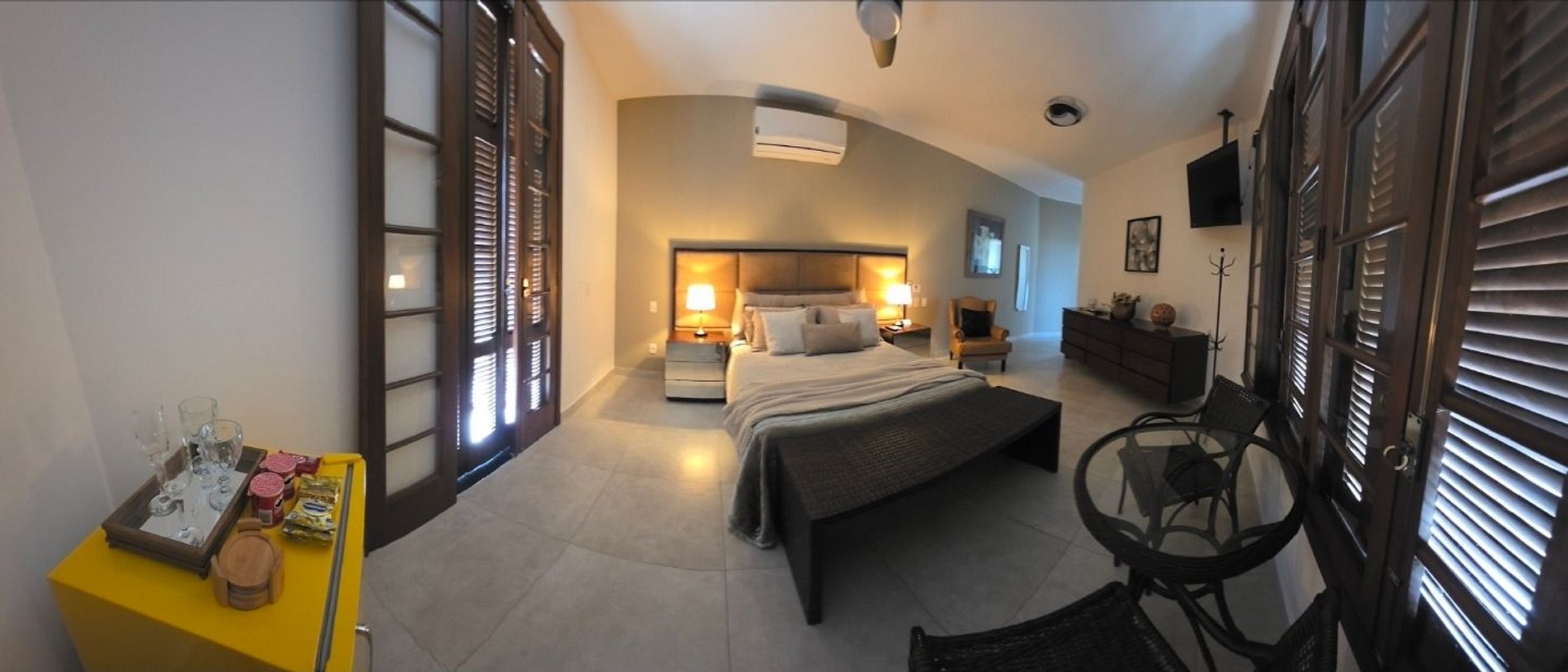 Desfrute de uma confortável cama Queen Size, frigobar retrô, ventilador de teto e ar-condicionado split de 18.000 BTUs para garantir seu conforto. O banheiro da suíte oferece charme e sofisticação. Relaxe na hidromassagem com bela vista para o mar e aproveite o pôr do sol com uma vista panorâmica de 180° da varanda.