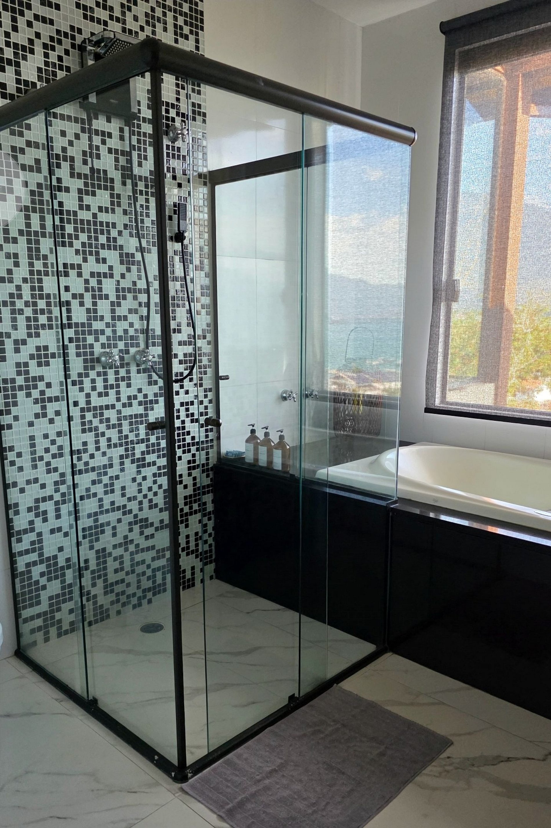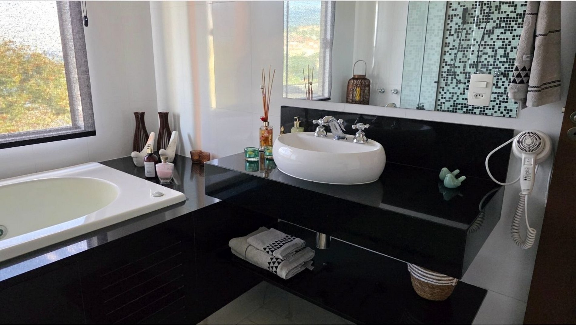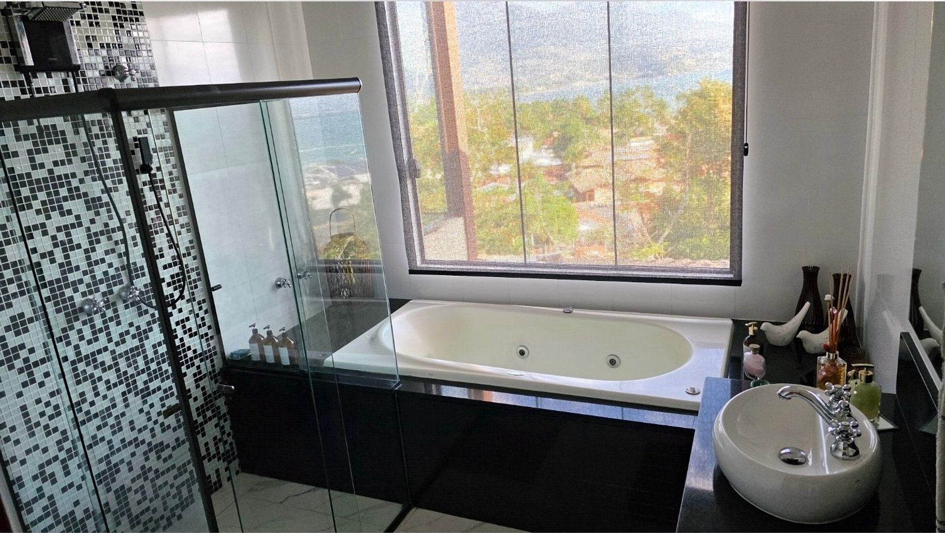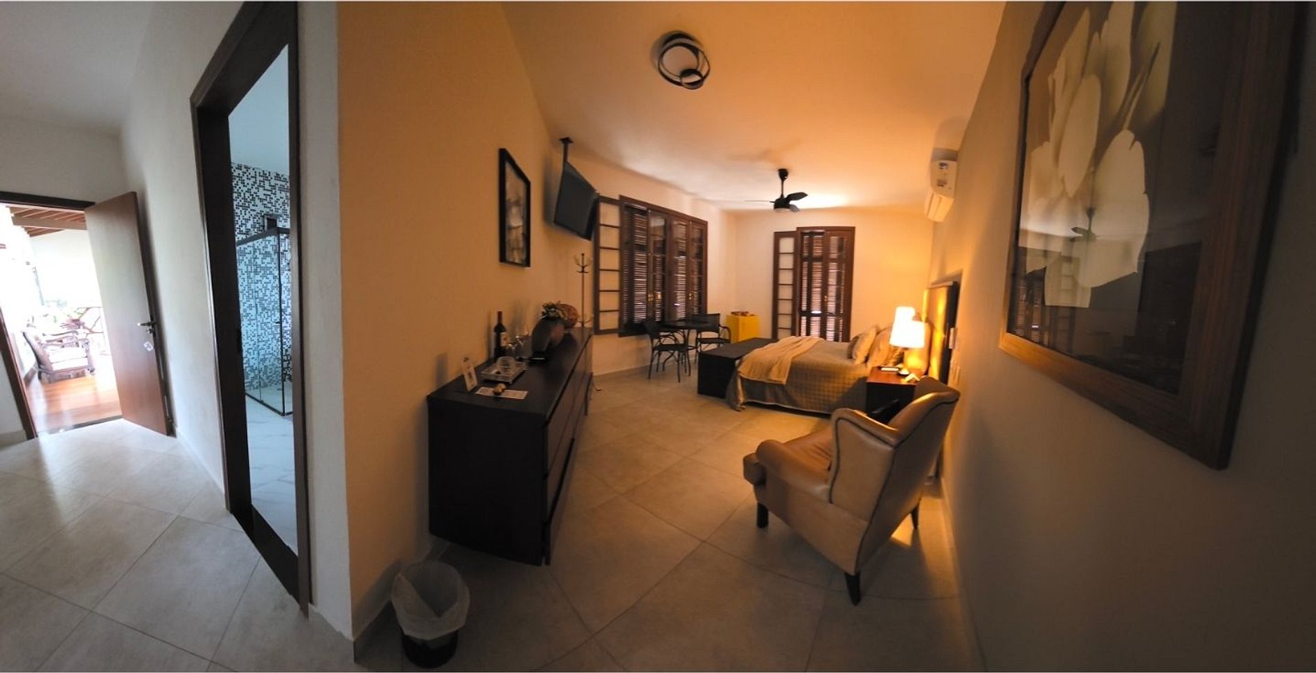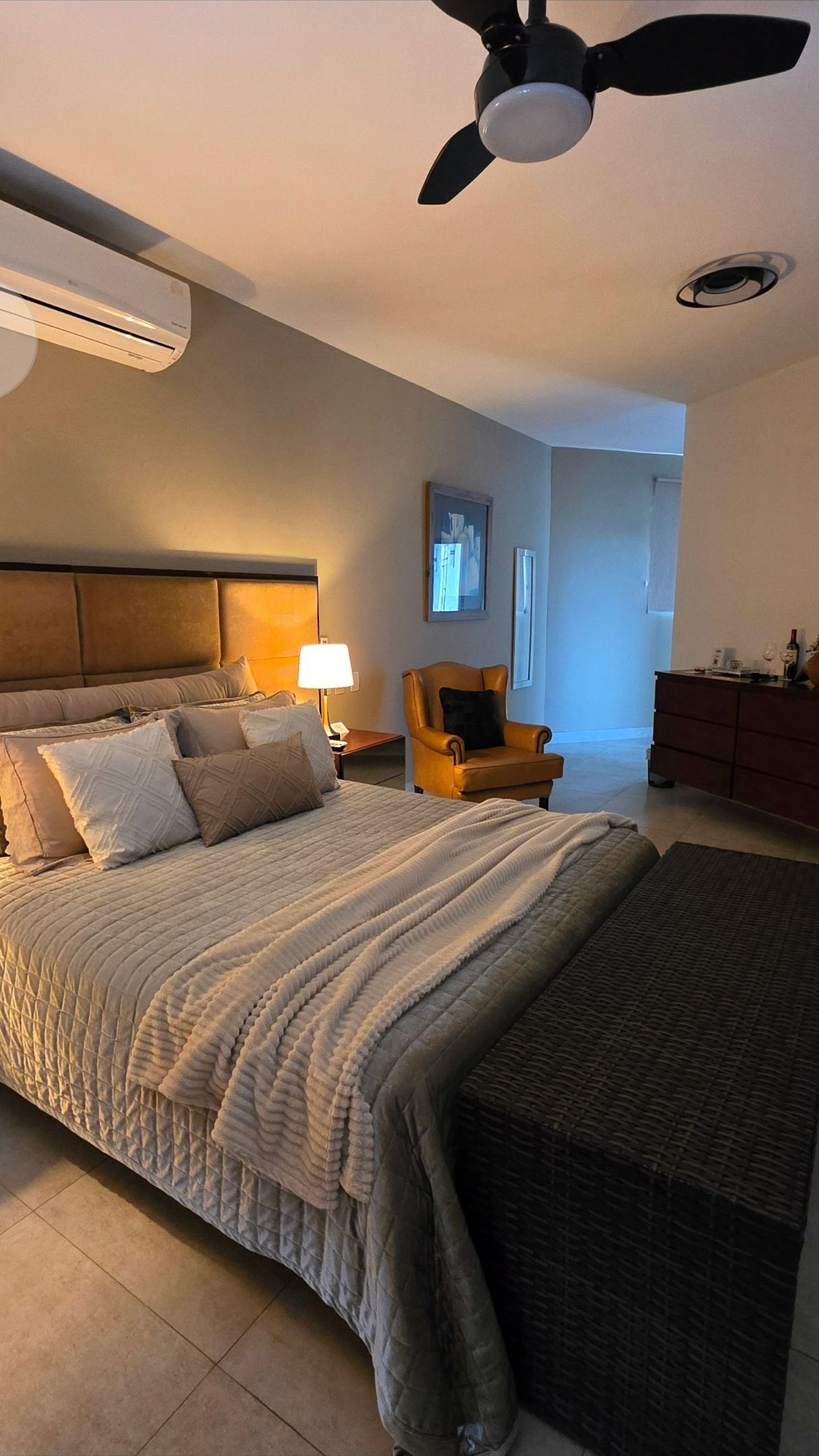 Desfrute de uma confortável cama Queen Size, frigobar retrô para um toque especial na decoração, ventilador de teto e ar-condicionado split de 18.000 BTUs, garantindo silêncio e conforto. O banheiro da suíte oferece beleza e sofisticação. Relaxe na hidromassagem com uma bela vista para o mar e aproveite o pôr do sol com a incrível vista panorâmica de 180 graus da varanda.